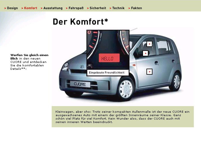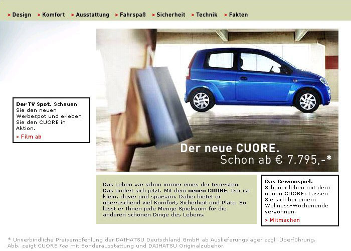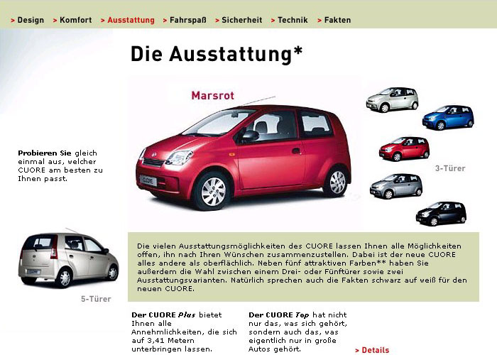 Auf 3,41 Metern vereint der Daihatsu Cuore alles, was man zum glücklichen Autofahren braucht. Das ist so viel, dass es für eine ganze Website reicht.